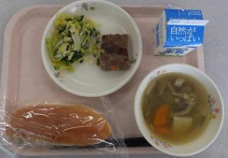 本日の給食の献立は、ミルクパン、牛乳、根菜のスープ、ミートローフ、こんにゃくサラダでした。ミートローフの肉は、りあさん・ゆいさんところの肉だそうで、とてもおいしかったです。スープは土の中にできる根菜をたっぷり使ったスープでした。温まりました。
