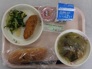 本日の献立は、レーズンパン、牛乳、春雨スープ、サケチーズフライ、菜の花あえ、三色花ゼリーでした。3月3日桃の節句は、おひな様や桃の花を飾り、子どもたちの健やかな成長と幸せをお祝いする日です。そこで本日は、菜の花を入れた菜の花あえや三色ゼリーで、春を感じる献立でした。菜の花は、焼米地区の船津のり子さんがつくられたものとのことです。