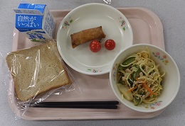本日の献立は、黒糖パン、牛乳、冷やし中華、春巻き、ミニトマト