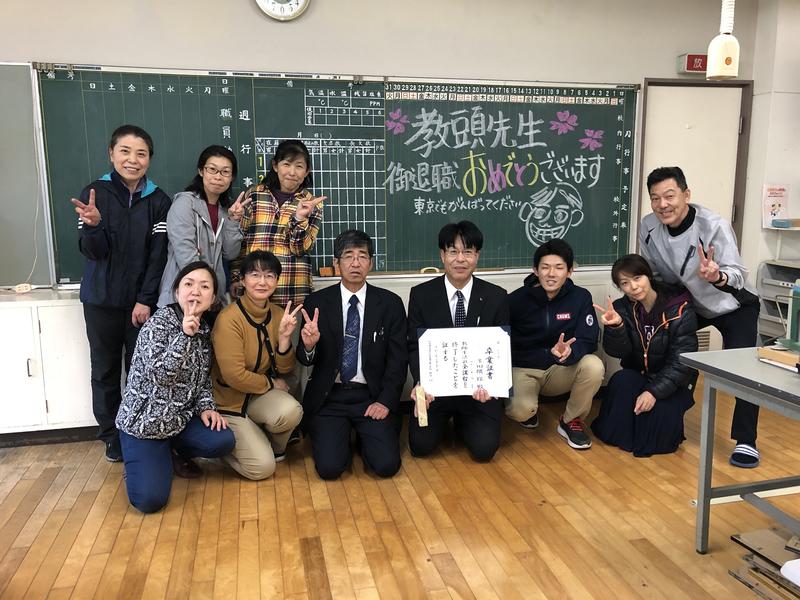 3月31日、この日は、教頭先生にとって最後の教職勤務の日でした。休みをとっている職員も多数いましたが、夕方にはほとんどが集まり、教頭先生の卒業式をして、記念写真を撮影しました。定年退職までの長年の勤務、大変ご苦労様でした。4月よりあしなが育英会東京本部に再就職されますが、さらなるご活躍を祈念しています。