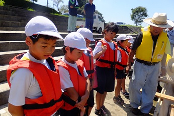 舟にのって、菊池川をさかのぼりました。3・4年菊池川学習