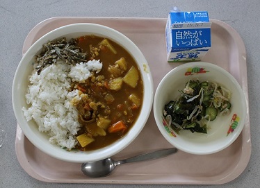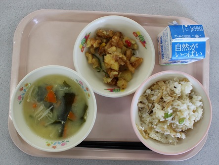 今日の献立は、麦ごはん、若竹汁、ちくわの磯辺あげ、春雨の酢の物、牛乳でした。若竹汁には、若布(わかめ)とたけのこが入っていました。若布(わかめ)もたけのこも今が旬の食材で、とてもおいしくいただきました。どのクラスもまったく残すことなくきれいに食べました。