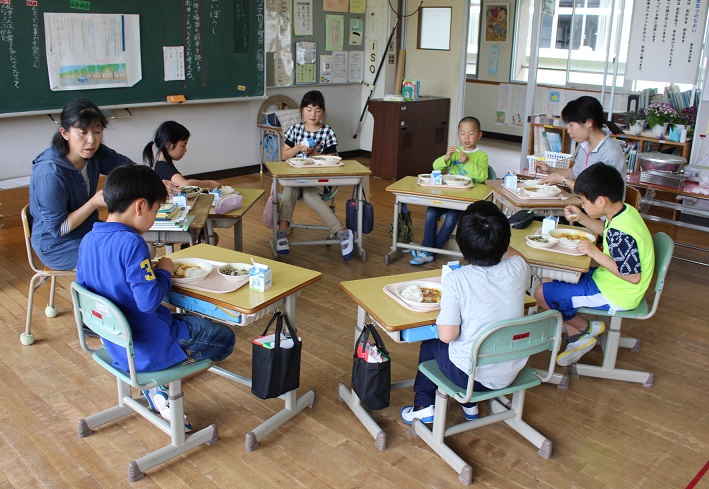 今日の給食はカレーライスでした。写真は3,4年生の会食風景です。