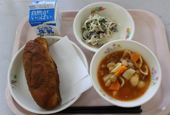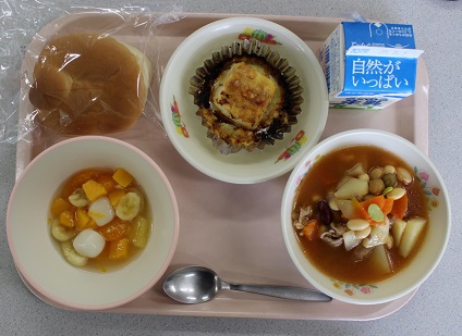 今日の献立は、ひのくにパン、ポークビーンズ、豆腐のチーズ焼き、フルーツ白玉、牛乳でした。調理場では、肉を扱うときに、肉専用のエプロンを着用し、使い捨て手袋をつけて、直接肉にさわらないように注意されてるとのこと。衛生面の配慮をしっかり行っておいしい給食を作ってくださっています。いつもありがとうございます。