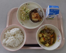 本日の献立は、つなひきよいしょ、牛乳、うすくず汁、じゃがたら、からしあえです。本日は、「ふるさとくまさんデー」で、山鹿・鹿本地方の郷土料理です。