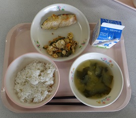 本日の献立は、麦ごはん、牛乳、魚の黄金焼き、夏野菜の味噌煮、ゴーヤチャンプルーでした。水泳大会の後で、くたくたでしたが、みんなしっかり食べきりました。また、今日は給食試食会ということもあり、たくさんの保護者の方と一緒に食べました。大人数で丸くなって食べる給食はとてもおいしそうでした。