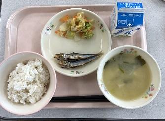 本日は「粗食の日」の献立で、麦ごはん、牛乳、里芋のみそ汁、めざし、白菜漬けです。学校給食の始まりは今から130年前までさかのぼりますが、本日はこのときの献立を参考にしてあります。当時は、ごはん、塩魚、菜っ葉の漬け物だけでしたが、学校でお昼ご飯が食べられるということで、子どもたちは大喜びだったそうです。今日はその時代のことを想像しながら、給食の有難みを感じました。