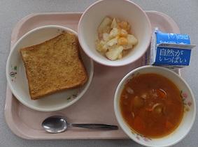 本日の献立は、ごまトースト、牛乳、ミネストローネ、ヨーグルトあえでした。ごまトーストは初めて食べましたが、おいしかったです。