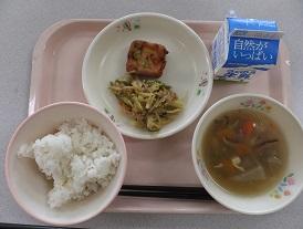 本日の献立は、麦ごはん、牛乳、のっぺ汁、ひじきと野菜の豆腐あげ、野菜のみそ炒めでした。野菜は炒めることで「かさ」が減りたくさん食べることができますので、本日の野菜炒めでたくさんの野菜をとることができたと思います。