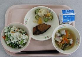 本日は「粗食の日」の献立で、麦ごはん、牛乳、里芋のみそ汁、めざし、白菜漬けです。学校給食の始まりは今から130年前までさかのぼりますが、本日はこのときの献立を参考にしてあります。当時は、ごはん、塩魚、菜っ葉の漬け物だけでしたが、学校でお昼ご飯が食べられるということで、子どもたちは大喜びだったそうです。今日はその時代のことを想像しながら、給食の有難みを感じました。