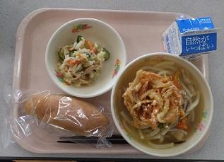 本日の献立は、玄米パン、牛乳、南関揚げ金栗うどん、野菜かき揚げ天、切干大根の酢の物でした。和水町の誇りである金栗四三さんは、隣りの南関町の小学校に毎日走って通っていました。それにちなんで南関揚げ金栗うどんが命名され、今日はそれにかき揚げをのせて食べました。ボリュームたっぷりのうどんと玄米パンでおなかいっぱいになりました。