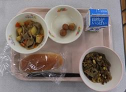 本日の献立は、麦ごはん、牛乳、のっぺ汁、ひじきと野菜の豆腐あげ、野菜のみそ炒めでした。野菜は炒めることで「かさ」が減りたくさん食べることができますので、本日の野菜炒めでたくさんの野菜をとることができたと思います。