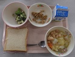 本日の献立は、ごまトースト、牛乳、ミネストローネ、ヨーグルトあえでした。ごまトーストは初めて食べましたが、おいしかったです。