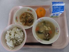 さて、本日の献立は、高菜飯、牛乳、だご汁、なすのひこずり、みかんです。食材や、給食を食べることができること、食材や、それに携わるいろいろな人々等、毎日感謝の気持ちをもっていただきたいものです。「いただきます」
