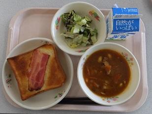 今日の給食は、ガーリックトースト、牛乳、チリコンカン、レタスとひじきのサラダですにくバターを塗り、ベーコンをのせて焼いてあります。