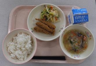 今日の給食は、麦ご飯、牛乳、肉団子のスープ、いわしのカリカリフライ、千草あえです。