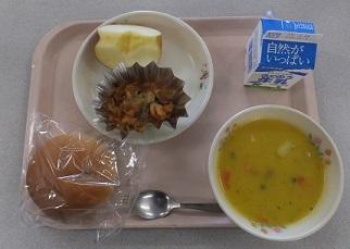 今日の給食は、米粉パン、牛乳、かぼちゃのクリーム煮、野菜のピザ焼き、りんごです。野菜のピザ焼きは、アルミホイルに野菜を入れて焼いてあります。栄養満点の給食、今日もおいしくいただきます。
