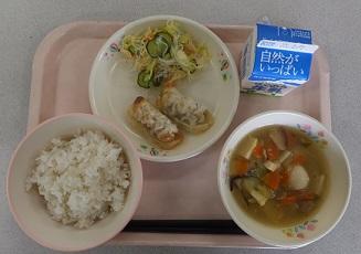 今日の給食は、麦ごはん、牛乳、八宝菜、ぎょうざ、春雨の酢の物です。