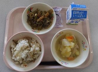今日の給食は、深川飯、牛乳、ポトフ、茎わかめのきんぴら、プルーンです。