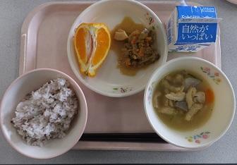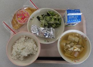 深川飯はあさりが入った混ぜご飯です。あさりは鉄分が多く、貧血の予防に効果的です。茎わかめのきんぴらとプルーンはかみかみメニューで児童生徒がよく噛んで食べることができるよう工夫されています。今日も残さずいただきます。