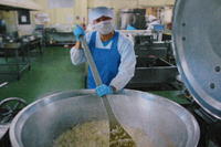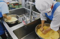 お茶ミルクゼリーは、今年の新茶を使用し、給食センターで手作りされています。写真は、作っているところです。