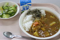 今日のメニューは、麦ごはん、牛乳、チキンカレー、いりこの酢だき、パインサラダです。