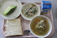 今日のメニューは、食パン、牛乳、中華五目スープ、いわしのソースからめ、フルーツクリームです。