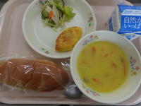 今日のメニューは、ミルクパン、牛乳、かぼちゃのクリーム煮、トマトオムレツ、豚しゃぶサラダです。