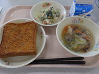 今日のメニューは、セサミトースト、牛乳、肉団子スープ、ビーンズサラダです。