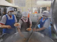 写真はカレーピラフを作っているところです。カレーピラフは炊き込みご飯で具を炊飯釜にいれて炊いています。