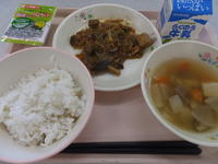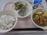 今日のメニューは、麦ご飯、牛乳、カレー肉じゃが、いわしの蒲焼き、即席漬けです。