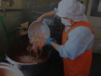 肉団子スープの肉団子は、調理場で挽肉に調味料をまぜて手作りされたものです。写真はスープに入れているところです。