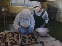 下の写真は、さばに下味をつけて、鉄板に並べているところです。この後にごまをふり、オーブンで焼きます。