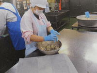 写真は、鶏だんごを作っているところです。鶏挽き肉にショウガや味噌をいれ、よーくこねているところです。