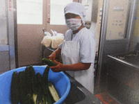 写真は、オクラをっているところです。野菜は専用のまな板と包丁をつかいます。