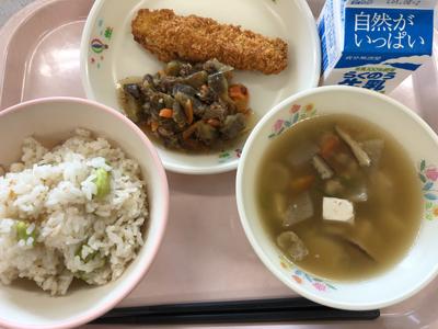 今日のメニューは、枝豆ごはん、牛乳、つぼん汁、太刀魚フライ、なすの炒め物です。