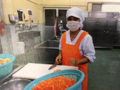 写真は、肉団子スープのにんじんを刻んでいるところです。肉団子は手作りしていただきました。