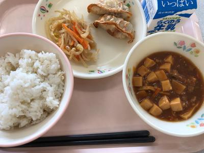 今日のメニューは、麦ご飯、牛乳、麻婆豆腐、ぎょうざ、ナムルです。