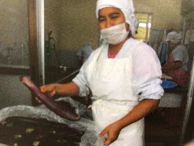 写真は、魚の切り身に、水で溶いた小麦粉をつけ、その後パン粉をつくているところです。