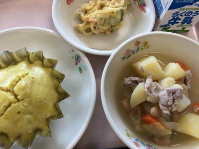 今日のメニューは、手作りカレー万、牛乳、ポトフ、ゴママヨネーズサラダです。