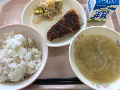 今日のメニューは、麦ご飯、牛乳、オニオンスープ、白身魚フライ、こんにゃくサラダです。