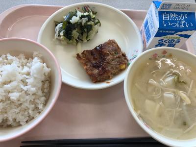 今日のメニューは、麦ごはん、牛乳、みそ汁、ミートローフ、海藻サラダです。