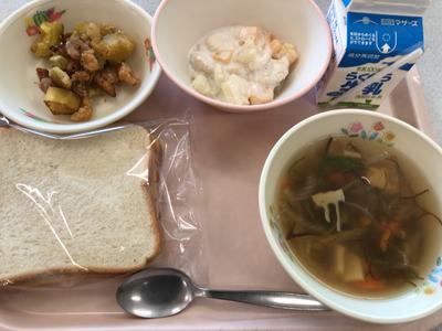 今日のメニューは、食パン、牛乳、もずくスープ、鶏肉とさつま芋の揚げ煮、フルーツクリームです。