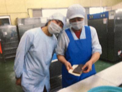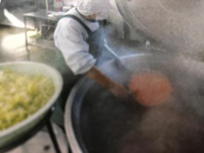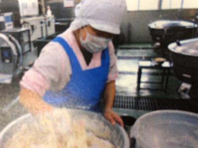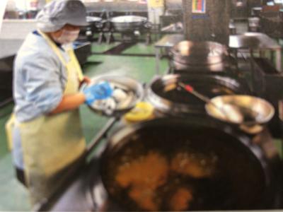 写真は、いわしの開きを油で揚げているところです。この調理機械は「フライヤー」といいます。約30リットルの油が入っているそうです。菊水共同調理場には2つあるそうです。