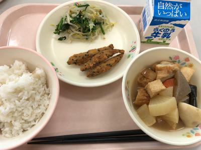 今日のメニューは、麦ごはん、牛乳、おでん、きびなごフライ、ピーナッツあえです。