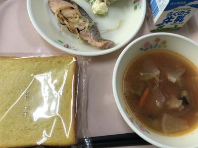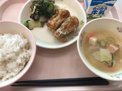 今日のメニューは、麦ごはん、牛乳、石狩汁、ちくわの二色あげ、白菜あえです。