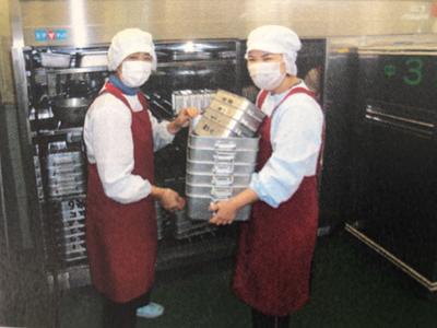 写真は、「熱風保管庫」から、揚げ物を入れるバットを取り出しているところです。調理器具は、洗浄→乾燥→加熱滅菌を行い衛生的に保管されています。
