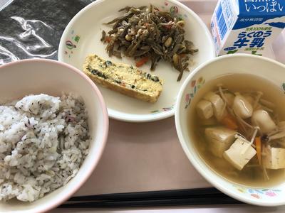 今日のメニューは、びりんめし、牛乳、だご汁、れんこんきんぴらです。