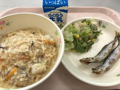 今日のメニューは、麦ごはん、牛乳、卵丼の具、ししゃも、枝豆のサラダです。