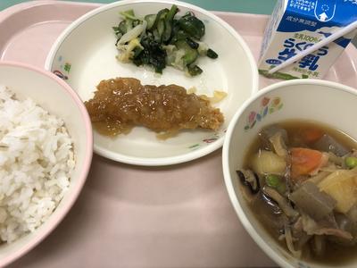 今日のメニューは、コッペパン、牛乳、栄養すいとん、鯨の竜田揚げ、ゆでキャベツです。